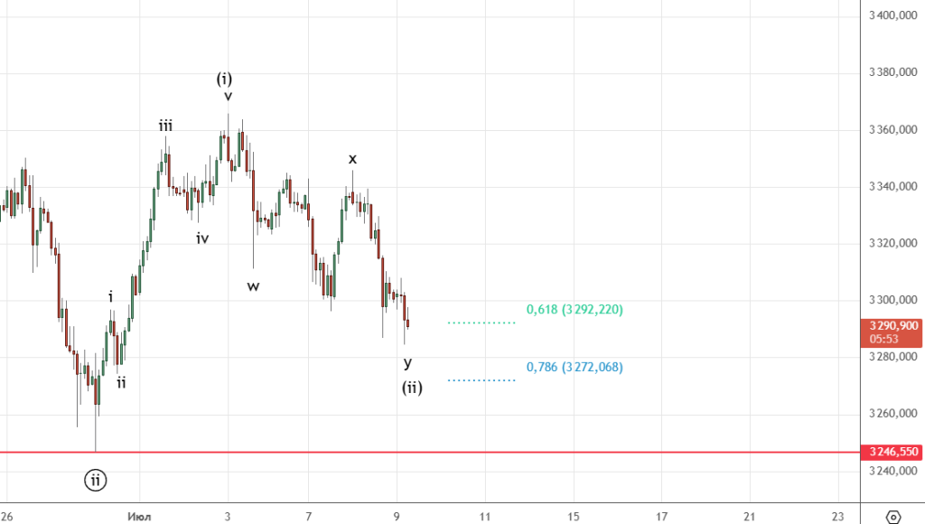 Идет коррекция , основные уровни сделали . Можно пробовать лонг , стоп 3246.55 . Сигнал не очень надежный из-за сдвинутого вправо цикла , это нужно учитывать.