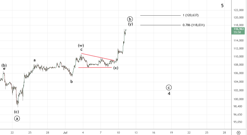 Сомнения по поводу разворота оправдались , видим мощный вынос . Надо делать еще несколько небольших подразделений вверх . Цели 118 и 120 . После резко вниз , и завершающая 5 . Альтернатива — разворот.