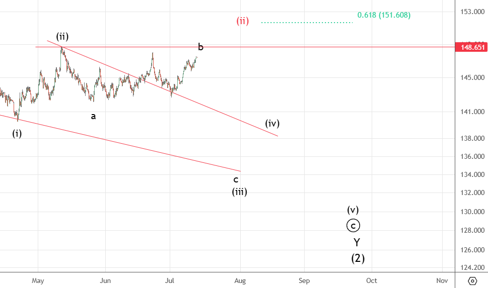 Без изменений. Красным альтернатива — продолжение волны (ii) к следующей цели 151.6.