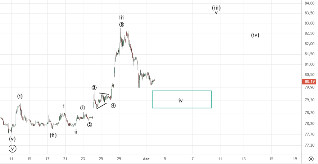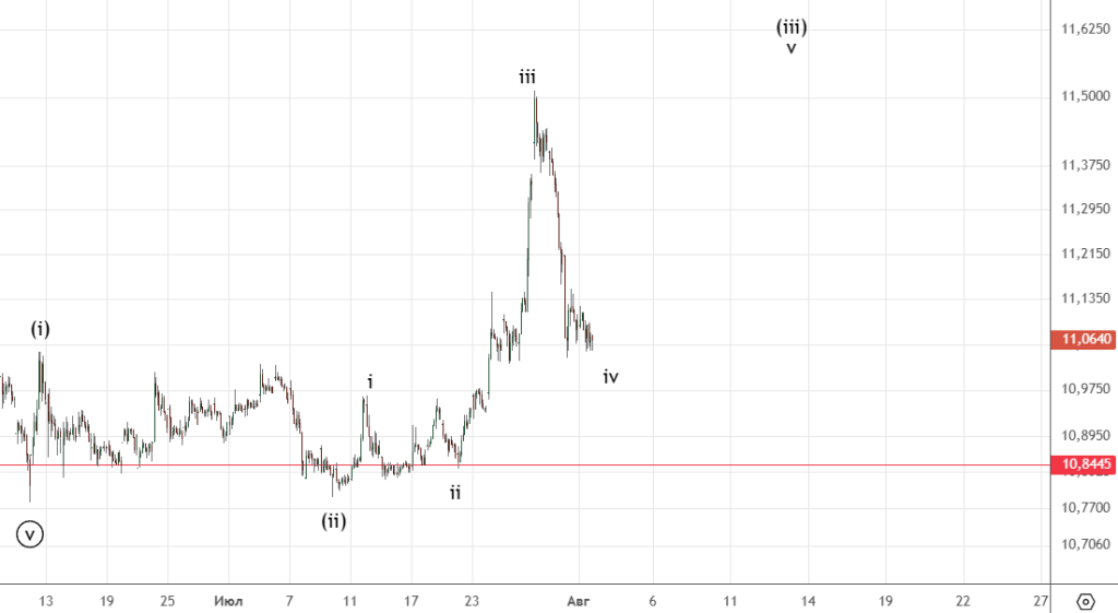 Резкое укрепление рубля сильно усложняет дальнейшее прогнозирование. На графике показан один из возможных сценариев с удлиненной волной ((5)) в iii . Скорее всего еще сделаем движение в указанный диапазон.