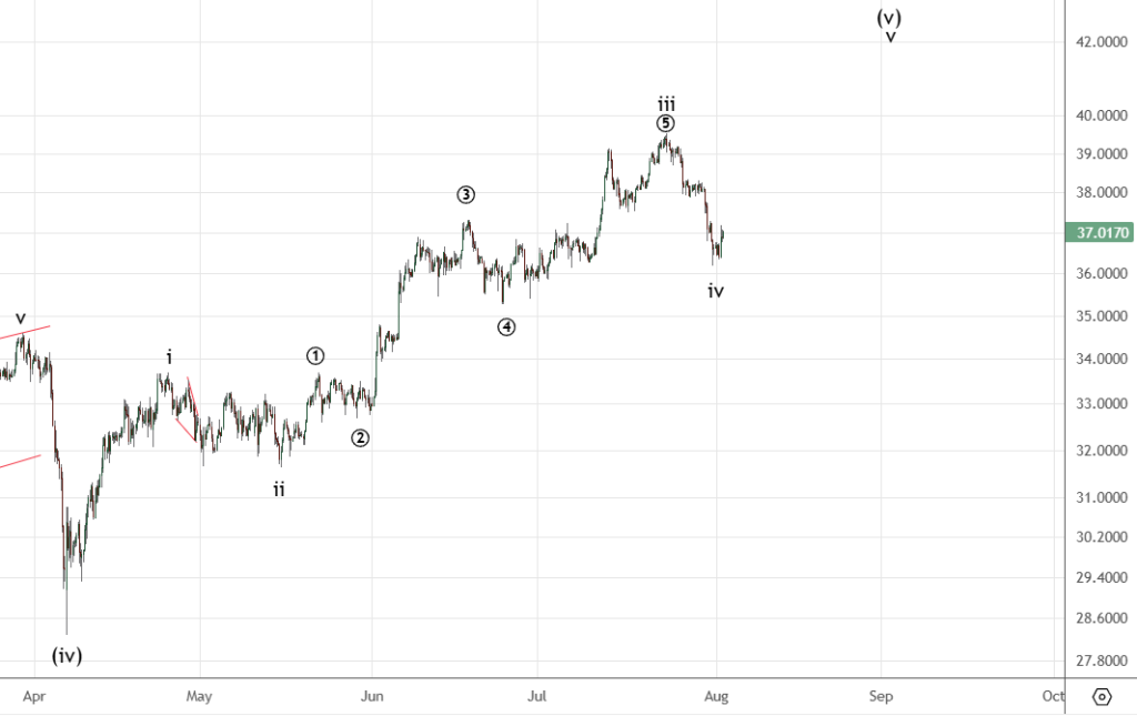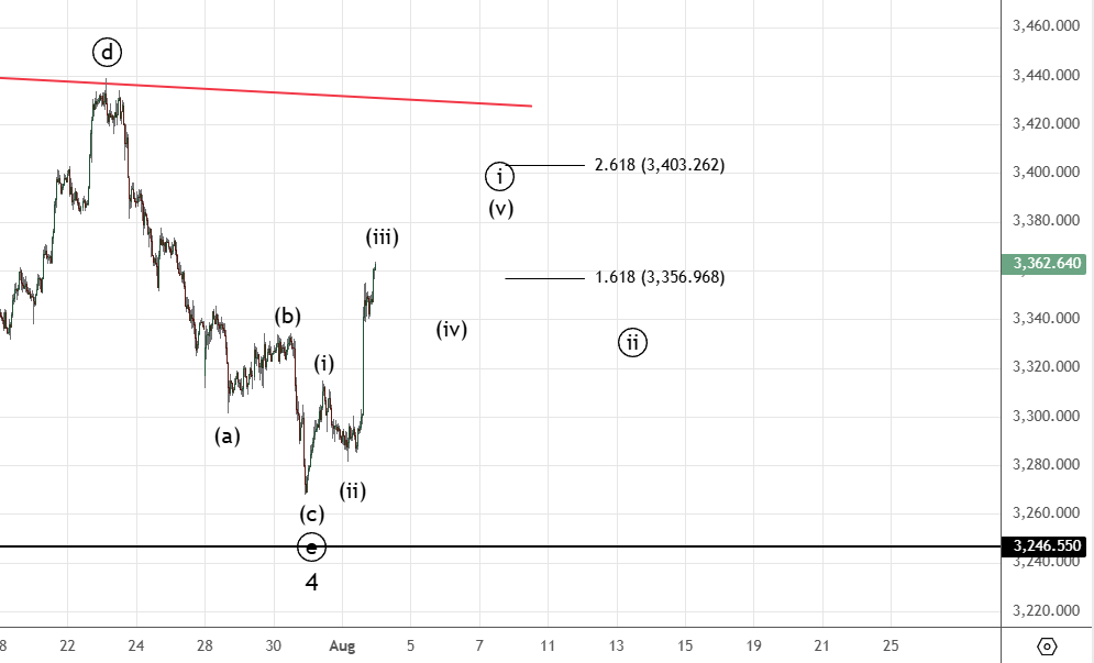 Вчера прошло резкое движение вверх , скорее всего треугольник в волне 4 завершился. Уровень 3246.55 также не прошли . На графике показаны цели для (iii) , после увидим коррекцию (iv) . После формирования импульса (i)) на коррекции ((ii)) можно будет становиться в лонг , либо докупать.