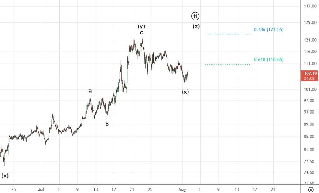 Возобновление падения криптовалют сильно запутывает интерпретацию волновой структуры . На графике показаны два варианта 1. Черным . Двойной зигзаг , цели 111195 и 105821 , после завершающая ((v)) вверх. 2. Начальная диагональ , вариант разворота . Нужно делать движения как схематично показано на графике.