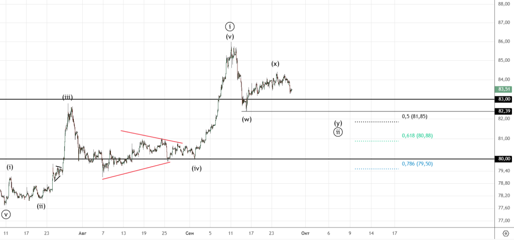 Попытка роста от 82.39 по структуре больше похожа на коррекцию , поэтому основной вариант предполагает продолжение снижения в волне ((ii)) . Альтернатива — вверх от 82.39 прошла начальная диагональ , пока этот сценарий выглядит менее вероятным.