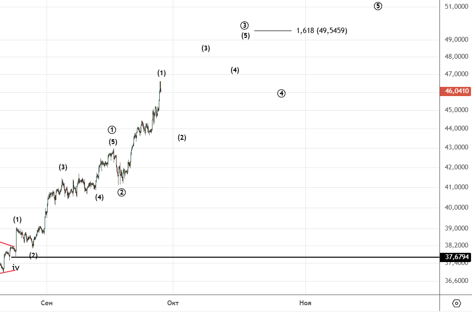 В связи с продолжением роста внесены изменения. Сейчас находимся в волне ((3)) — цель 49.546. , возможно уже закончилась (1) в ((3))