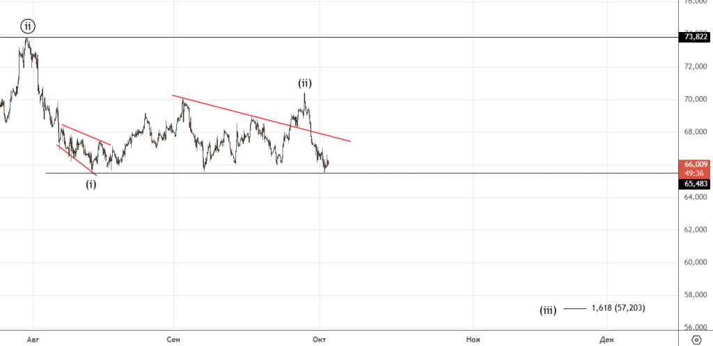 Быстро пошли вниз , пробили трендовую красным , снова тестируем уровень 65.483 , но пока его не прошли . Вполне вероятно в ближайшее время протестируем красную уже снизу и только потом вниз.
