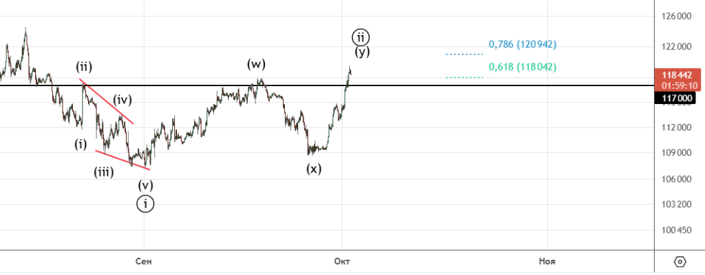 Рост выше 117 000 — это бычий сигнал , хотя формально ничего не нарушено , есть еще цель 120942 . Пока наблюдаем. Для подтверждения снижения важно снова уходить ниже 109 000.