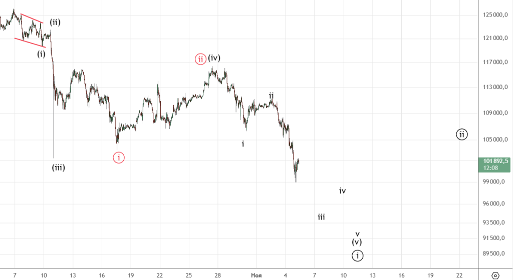 Пробита долгосрочная трендовая черным , это очень важный сигнал, отскочили от 99000 , возможно еще протестируем трендовую снизу . Если пойдем дальше вниз , то до 89000 — 88000 ничего не держит.