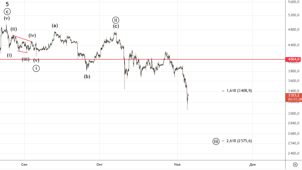 Как предполагалось сделали новый минимум . Скорее всего падение еще не закончилось. Красным показана альтернатива — коррекция ((ii)) уже завершилась , а (v) в ((i)) была укороченной , разницы между ними особой нет.