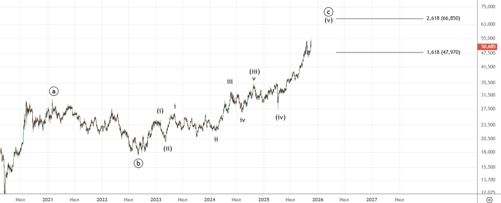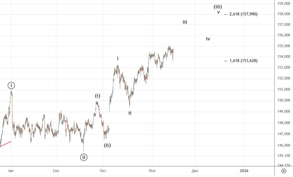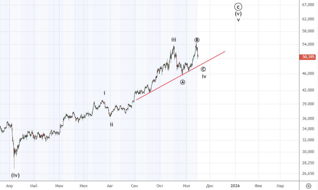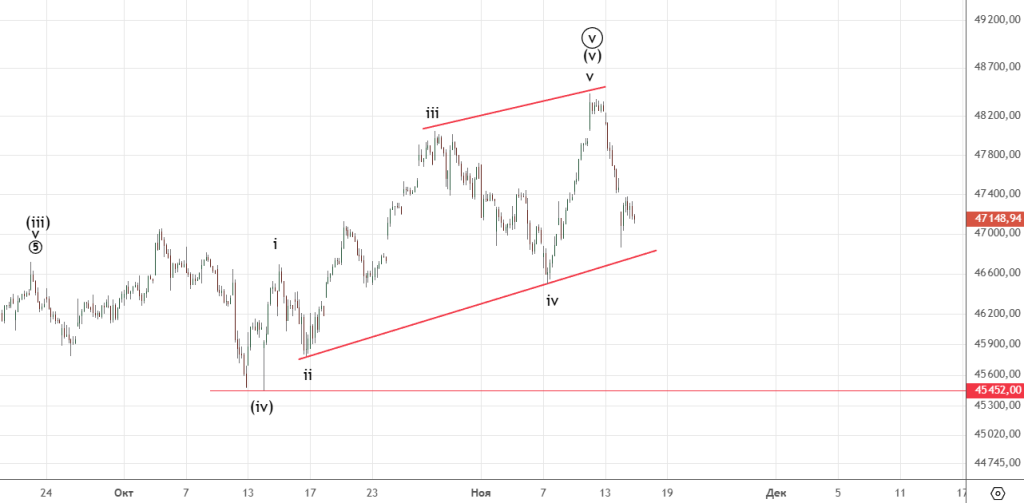 Тут сделали новую вершину , подсчет немного корректируется. Движение вниз неплохое , но четкого импульса пока нет . Важная отметка для подтверждения разворота — 45452.