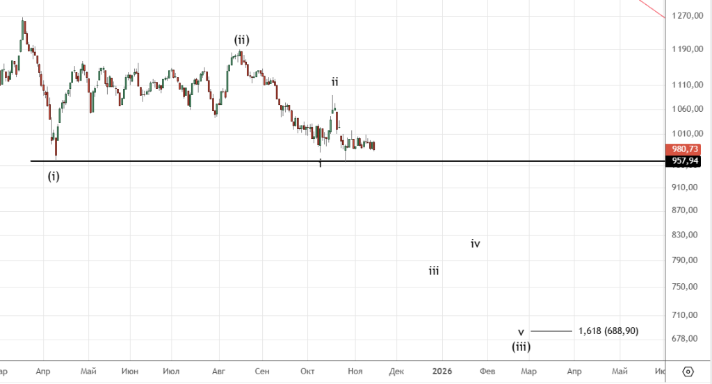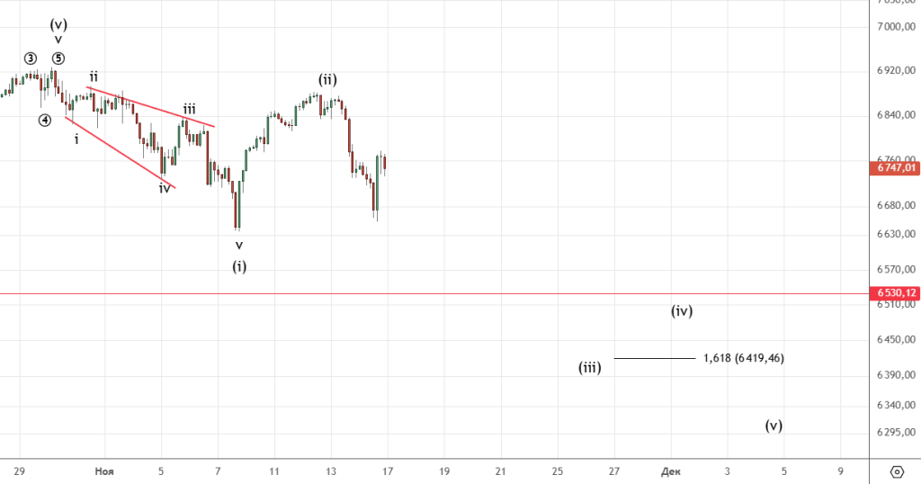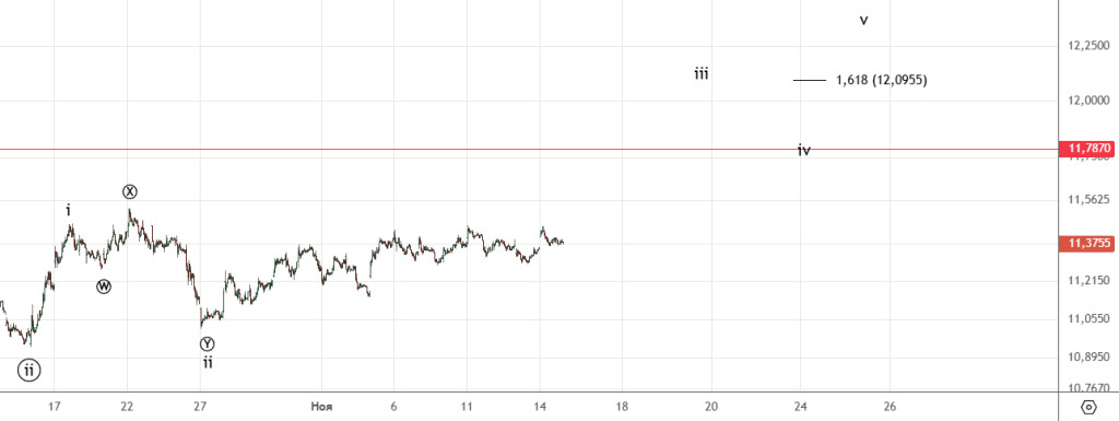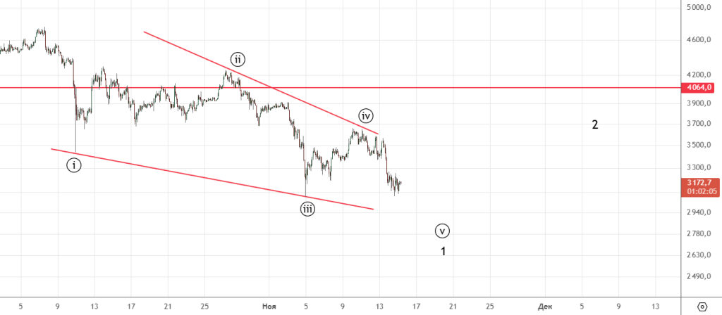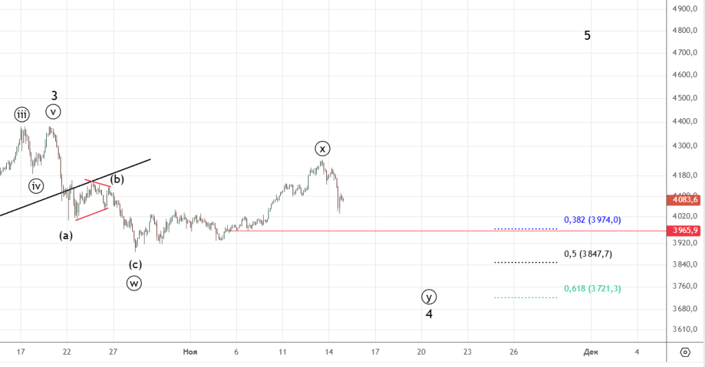 Ждали коррекцию , вот она и началась . Ниже сценарий с продолжением падения , однако считаю вариант Пректера более вероятным т.е. уже развернулись . Решающая отметка 3965.9 (минимум 06.11) , если её пройдем , то стоит ожидать продолжение падения.