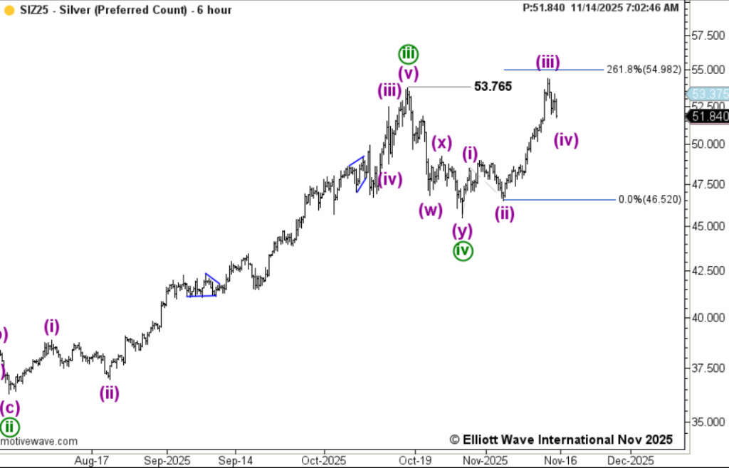 Более мелкий график . Скорее всего идет плоская коррекция в волне iv , и похоже она еще не закончилась . Ближайший уровень поддержки — район 48.3.