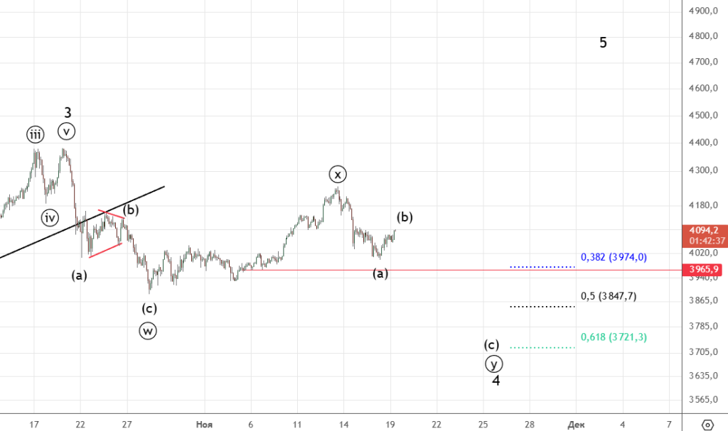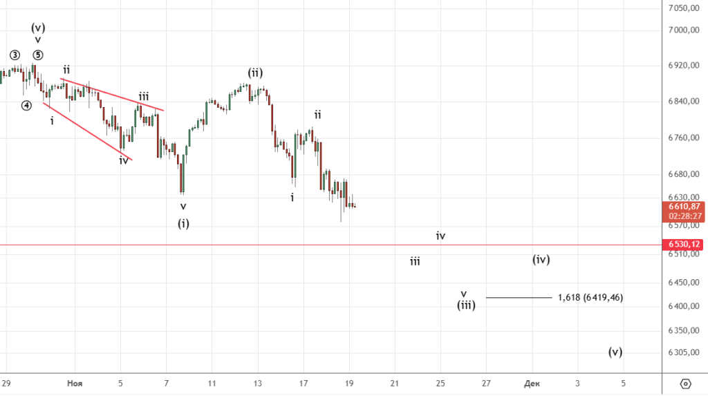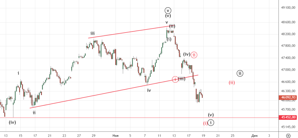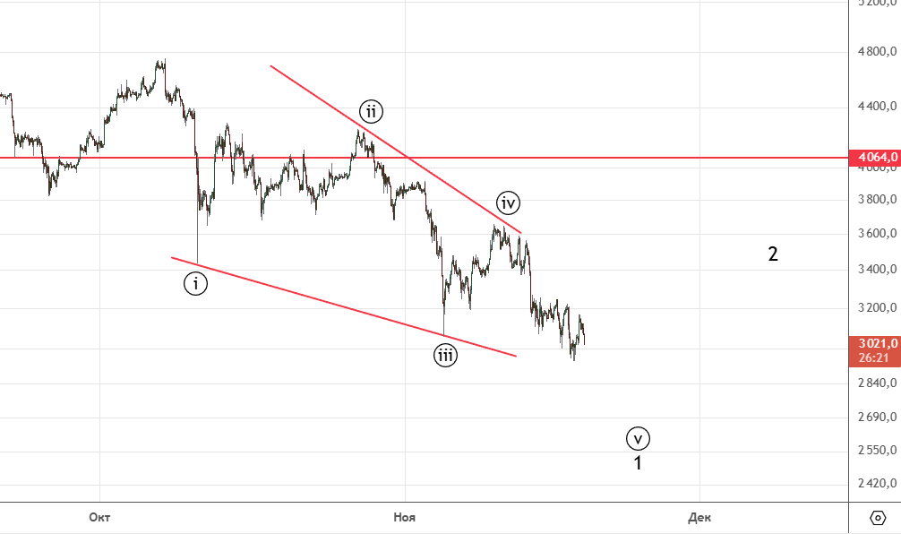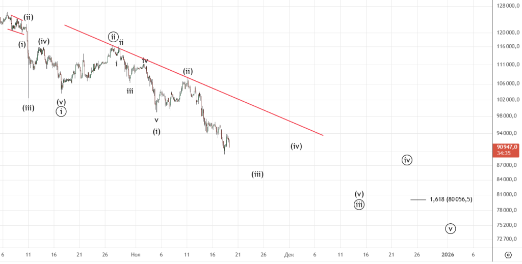 В связи с сильным падением корректируется подсчет на более медвежий. Цель 80 000 , такой подсчет коррелирует с продолжением снижения фонды. Красным показана трендовая — уровень сопротивления.