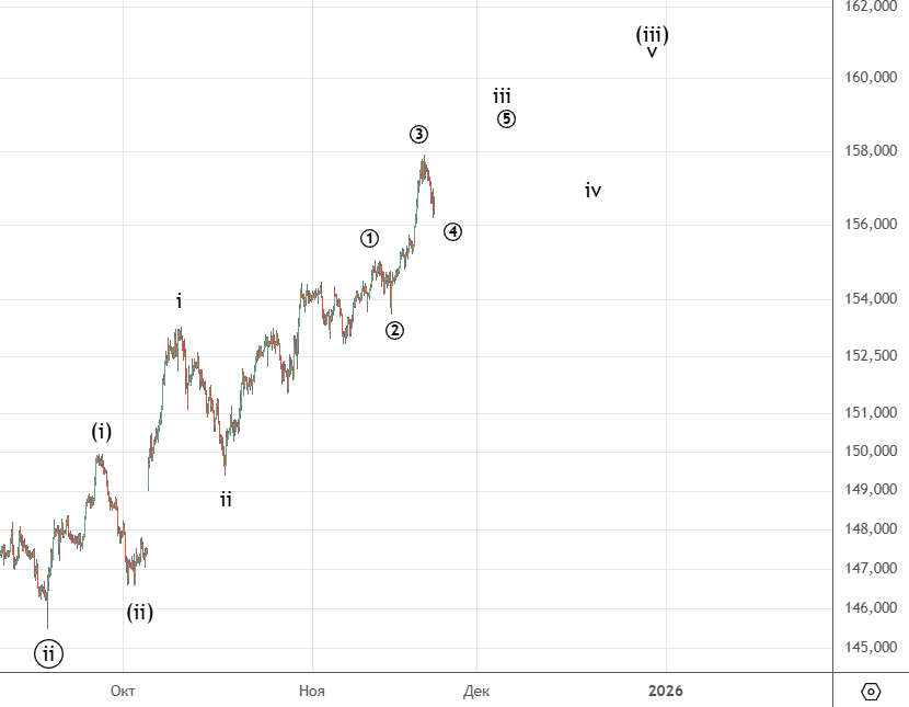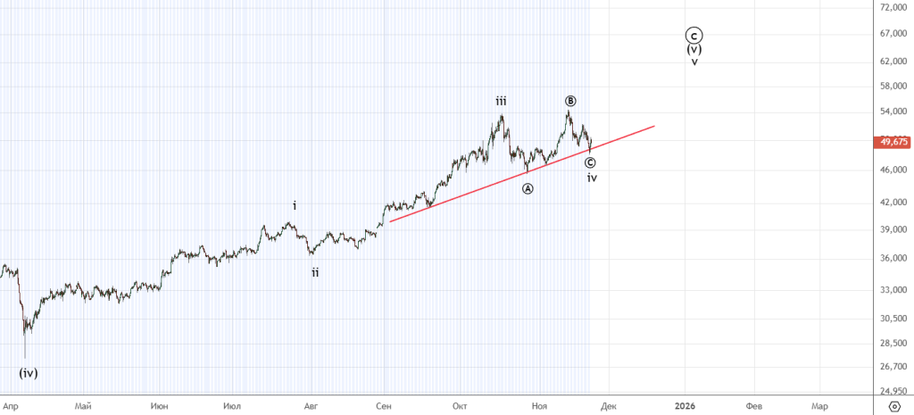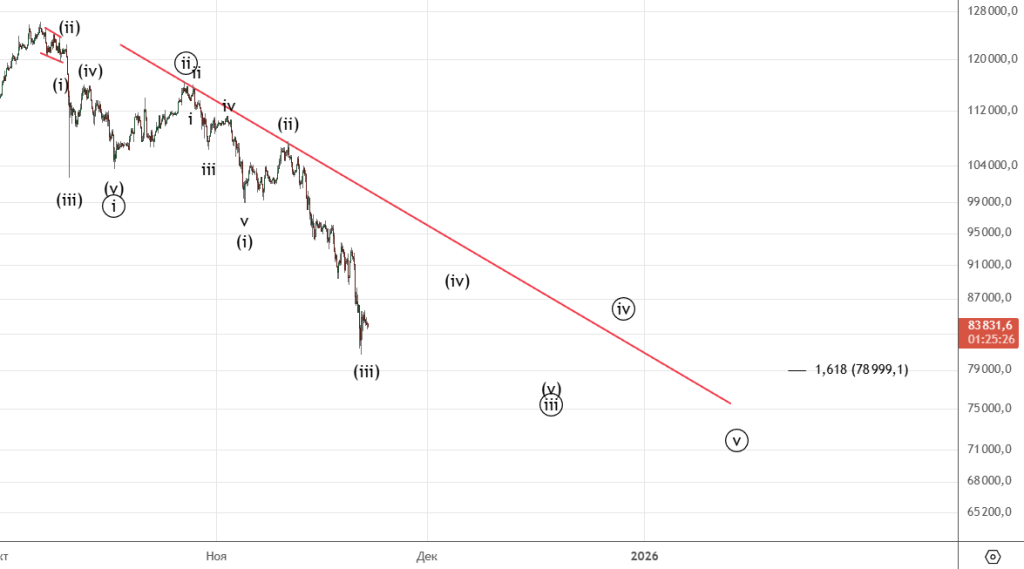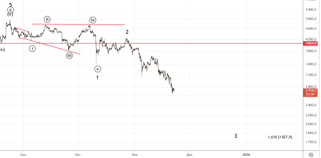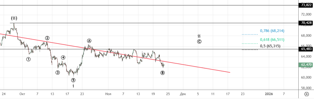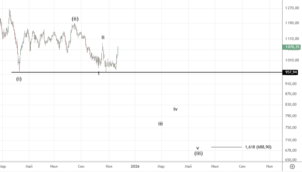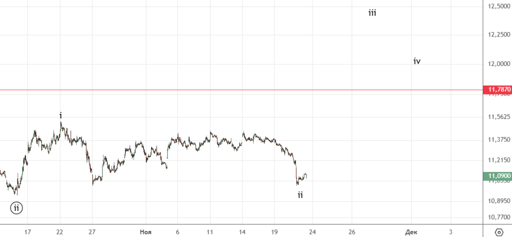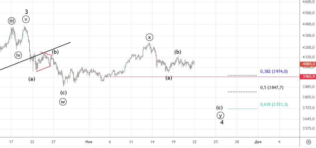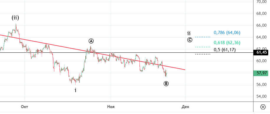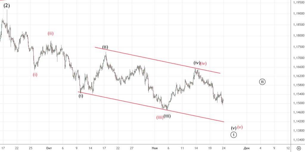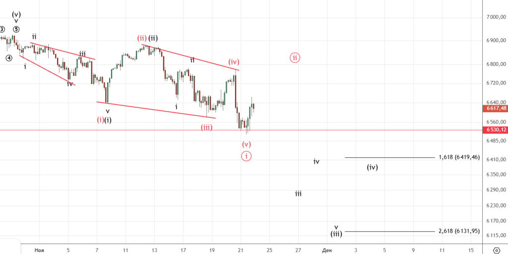Снижение продолжилось , но идет оно как-то невнятно. Красным показан вариант начальной диагонали , и учитывая фин. условия он выглядит более вероятным. Черным альтернатива — продолжение падения.