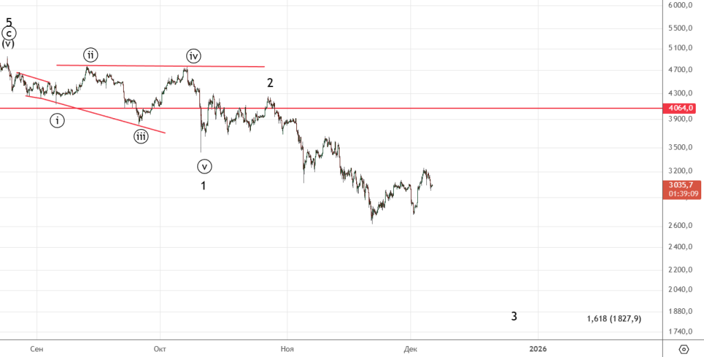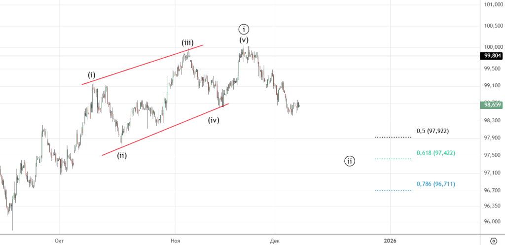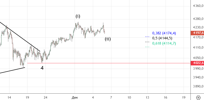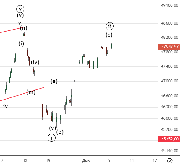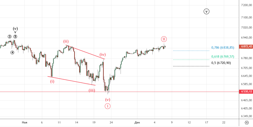 График немного не совпадает с индексом , тут 21.11 была новая вершина. Вариант завершенной начальной диагонали от 17.09 выглядит более естественно. Коррекция в волне ((ii)) это движение на минимумы СС цикла. Скорее всего оно будет продолжаться до НГ.