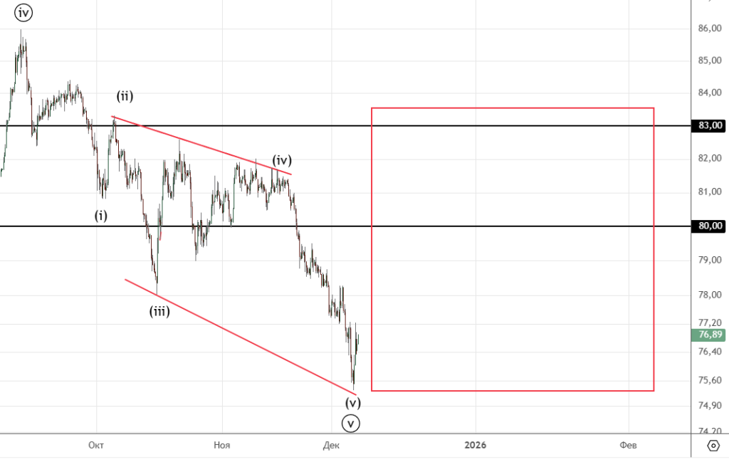 Практически сделали ожидаемые 75.4 , в пятницу был неплохой отскок , но пока это зигзаг . Разворот не подтвержден , нужно делать четкий импульс и возвращаться в диапазон 80 — 83 .