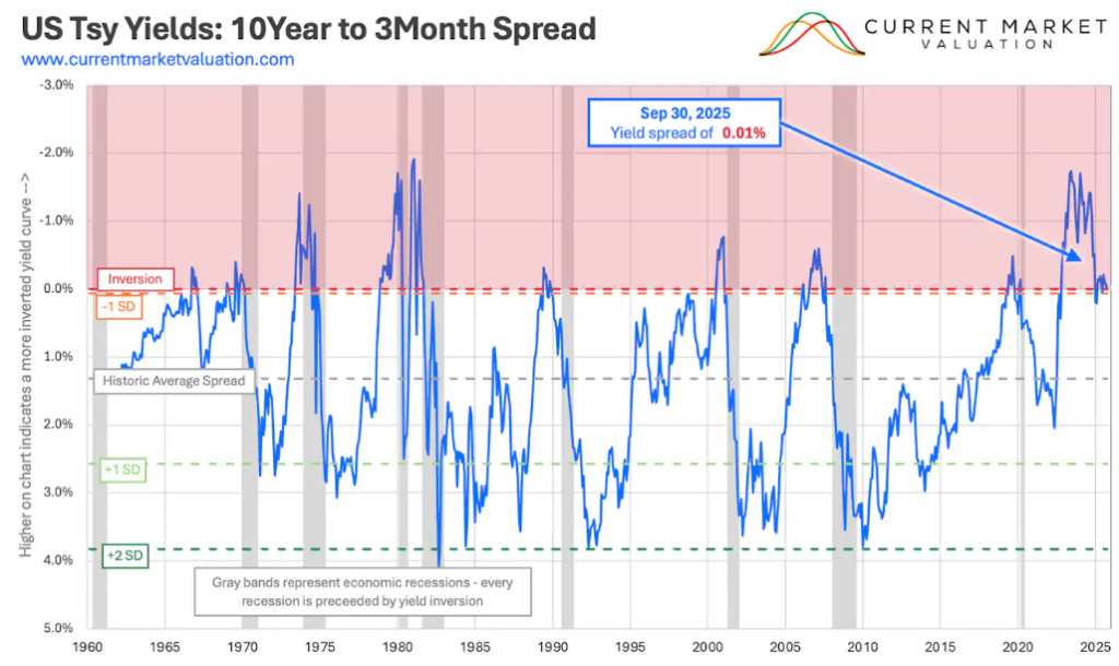 Ниже спред между 10-летками — 3-месячными облигациями . Как видно движение в отрицательную зону (красным) и последующий возврат выше 0% всегда приводил к кризисам