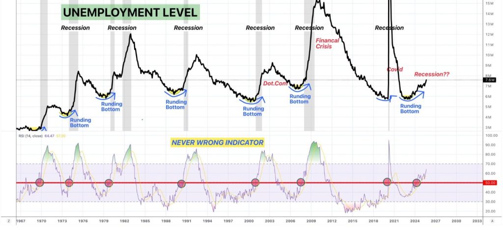 Индикатор уровень безработицы + фильтр RSI . Когда RSI уходил выше 50 (показано на графике), через короткий промежуток времени начинался кризис.