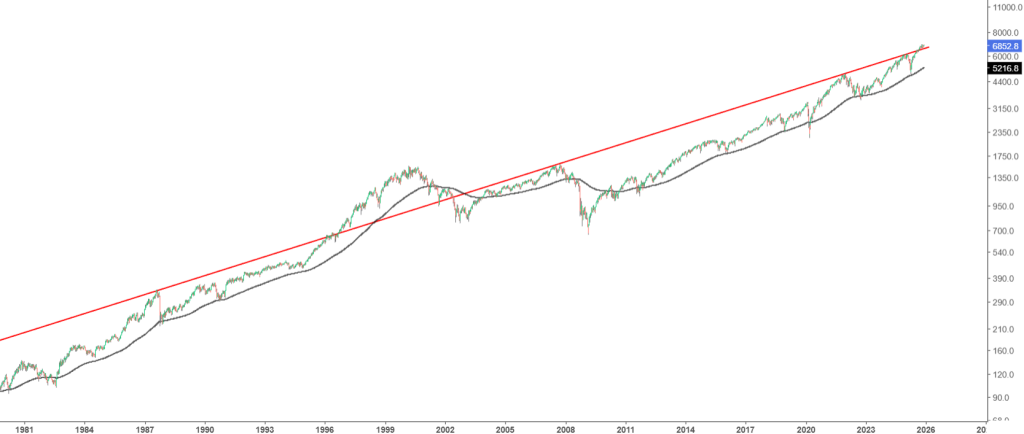 На графике ниже показана трендовая красным , она идет с примерно с 1987-го , и видно , что часто была важным долгосрочным уровнем поддержки и сопротивления. Сейчас её тестируем . Черным показана EMA200 . Если начнем падать , то важно пройти и закрепиться ниже , плюс пробить уровень 4802 ( минимум апреля 2025)