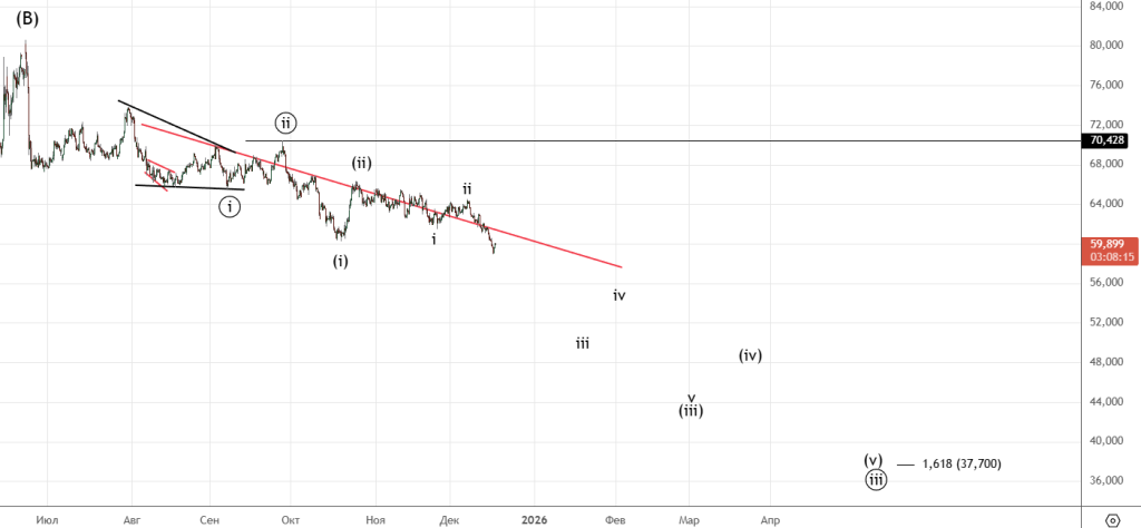 Падение продолжилось без ожидаемого движения вверх. Снижение с конца октября скорее всего было начальной диагональю в волне i . На графике показан основной сценарий , но вариантов подсчета тут много т.к. волновая структура сильно запутанная. Пока все также ориентируемся на трендовую красным.