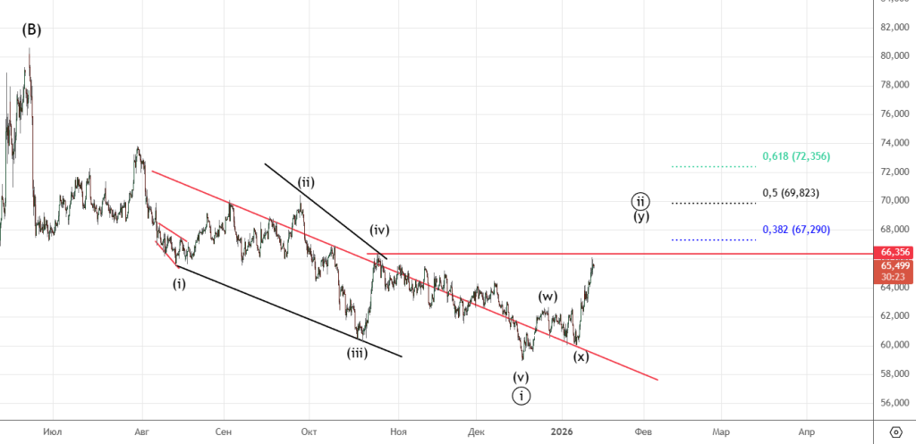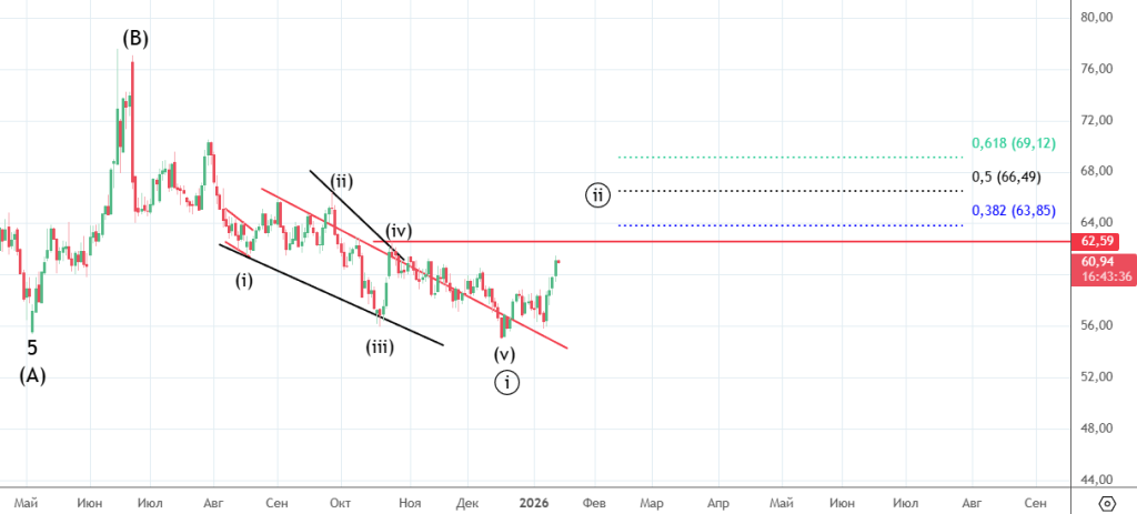 Рост продолжается , есть смысл уже пересматривать подсчет . Предполагается , что идет коррекция всего движения с конца июня . Тогда также был подсок на геополитике связанной с Ираном , тоже самое получается и сейчас. Указаны основные цели , приоритетная 69.8 , после падение возобновится.