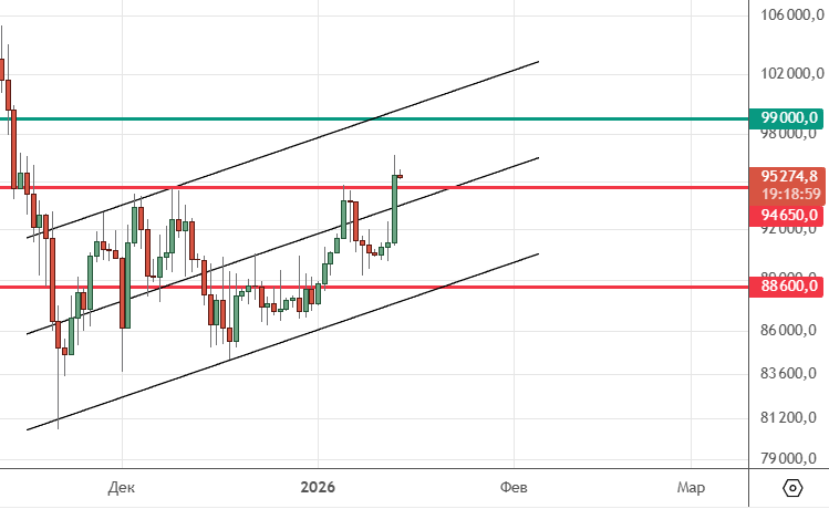 Неожиданный подскок выше 94650 ,открывается путь на 99000 тем не менее ничего страшного пока не произошло .Пока наблюдаем .