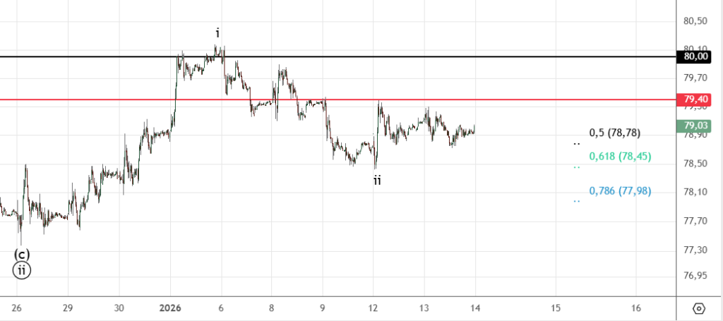 В понедельник был подскок , сейчас идет коррекция боковик . Важный уровень 79.4 и следующий 80 , если их пробьем , то скорее всего будет ускорение роста.