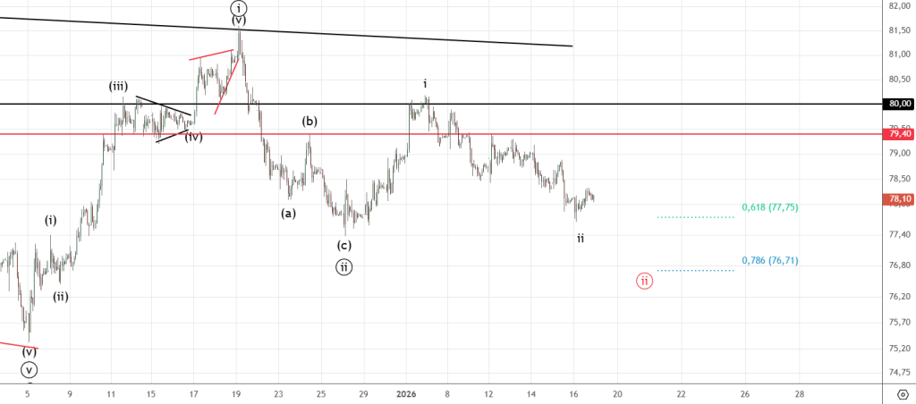 Неожиданное укрепление рубля , тем не менее страшного ничего не произошло . Возможно еще не закончилась волна ((ii)) и еще сходим на 76.71 . Вверху важные уровни 79.4 и 80 .