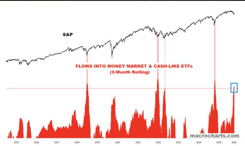 На фоне геополитической неопределённости инвесторы паркуют капитал в кэше одним из самых быстрых темпов в истории. Это признак резкого снижения risk appetite: рынок уходит в защиту, фиксирует прибыль и предпочитает ликвидность рисковым активам на фоне растущей макроэкономической неопределённости.